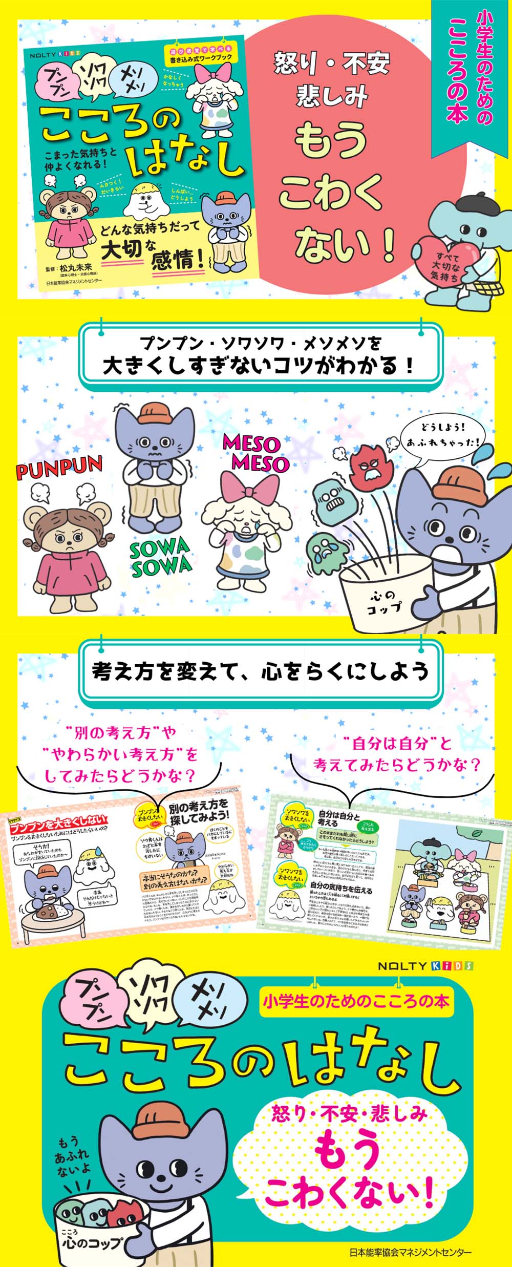 ステップ1では深呼吸やお守りカードなど、こまった気持ちを大きくしないために即効性のある方法を伝授。プンプン(怒り)・ソワソワ(不安)・メソメソ(悲しみ)を感じて困ったときにすぐに対応できるようになることでお子さまに自信がつきます。ステップ2ではどうしてこまった気持ちになるの?という理由を大解明!プンプン・ソワソワ・メソメソというネガティブな感情を悪いものと決めつけず、そのような感情が生まれる理由や機能を知ることで、「こまった気持ち」を受け止めやすくなっていきます。ステップ3では物事の見方や考え方を変えて心を楽にする方法を具体的に紹介。「やわらかい考え方」「別の考え方」など、いろいろな角度から考えるクセをつけることで、困った気持ちを大きくしすぎないコツを身につけていきます。